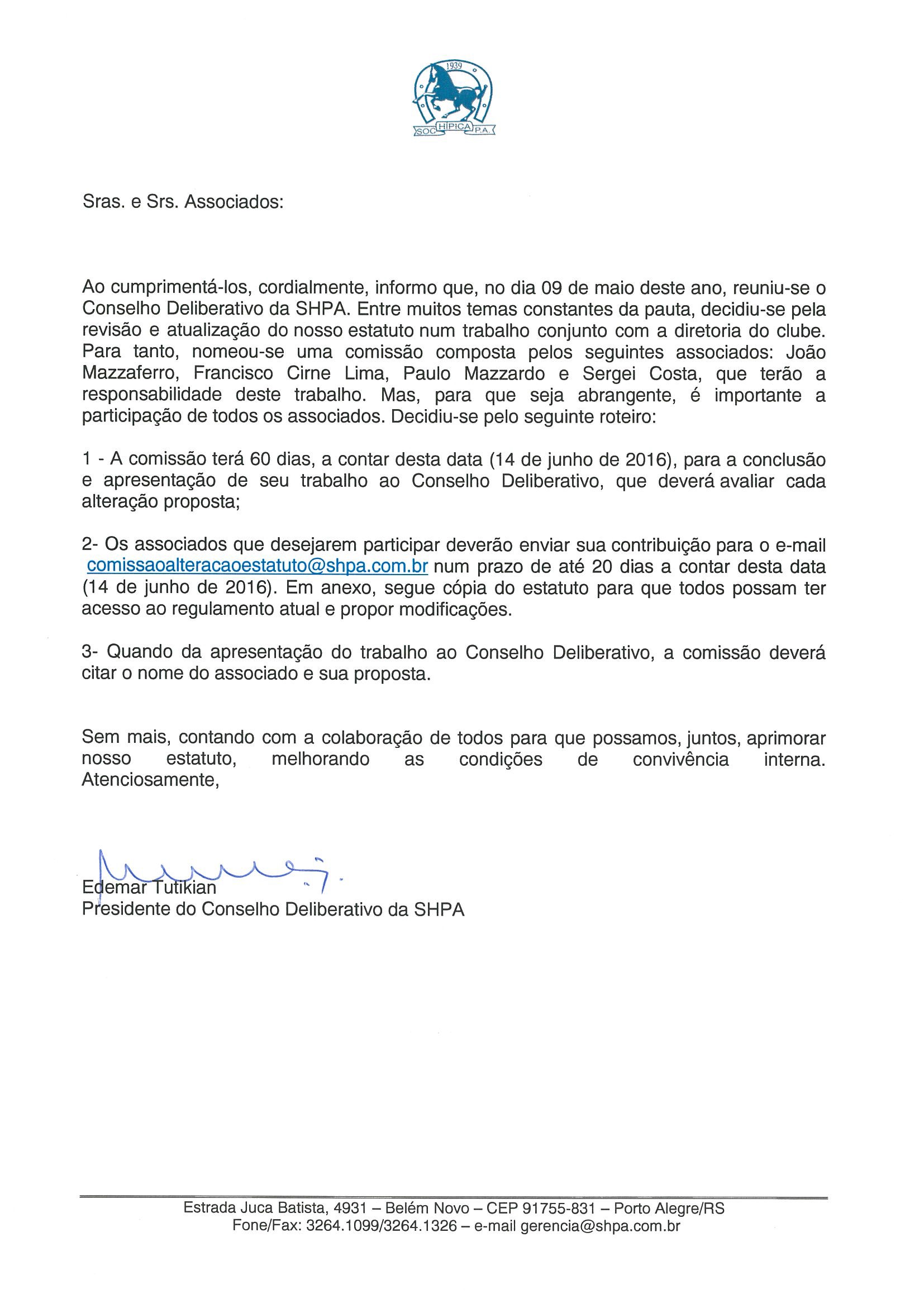 Carta aos sócios: Alteração de estatutos de nosso clube. Post publicado:14 de junho de 2016 Clique aqui para visualizar o Estatuto atual.