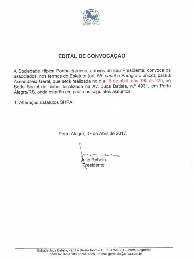 EDITAL DE CONVOCAÇÃO: Assembléia Geral dia 18 de Abril.
