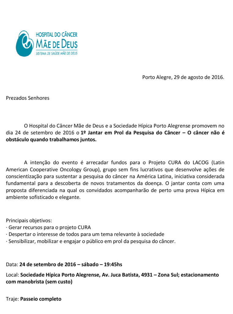 O Hospital do Câncer Mãe de Deus e a SHPA promovem no dia 24 de setembro de 2016 o 1º Jantar em Prol da Pesquisa do Câncer – O câncer não é obstáculo quando trabalhamos juntos. Post publicado:6 de setembro de 2016