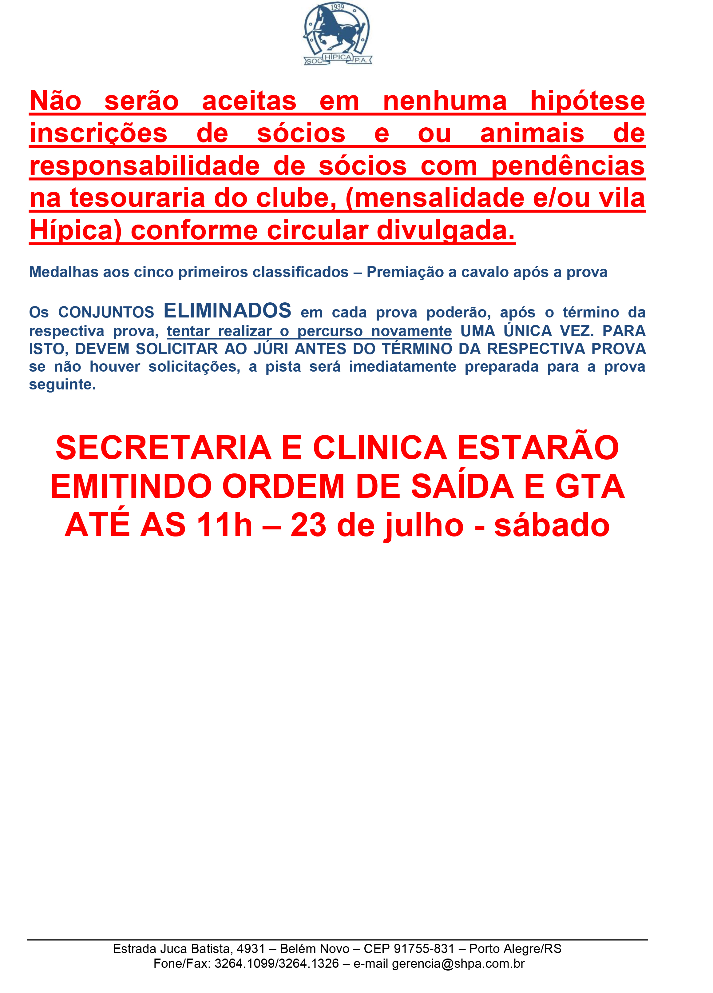 • A Sociedade Hípica Porto Alegrense, com o objetivo de preservar a segurança sanitária dos animais estabulados no clube e daqueles que participam de suas atividades e eventos, mantém como exigência obrigatória a vacinação contra Influenza Equina e Encefalomielite Equina, bem como a apresentação de exames negativos para Anemia Infecciosa Equina (AIE) e Mormo. 6 de março de 2026