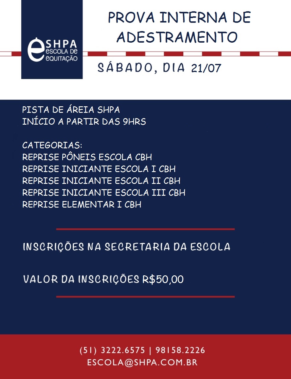 Prova Interna de Adestramento, Sábado 21/07, início as 9 horas.