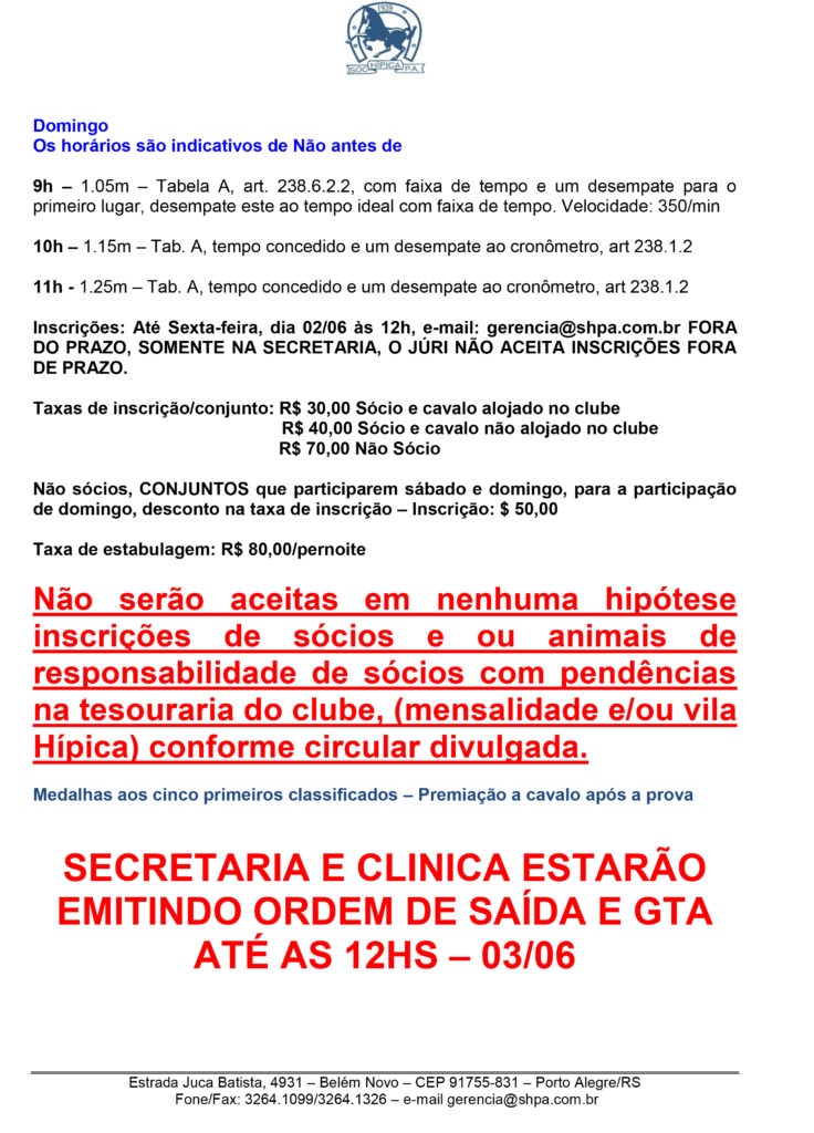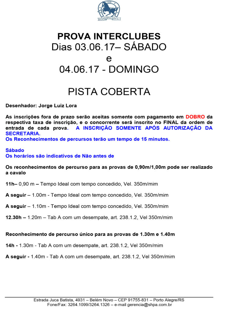 Segue programação do Interclubes, a realizar-se dias 03 e 04 de junho na Sociedade Hípica Porto Alegrense (inclusão da prova de 1,10m no sábado).